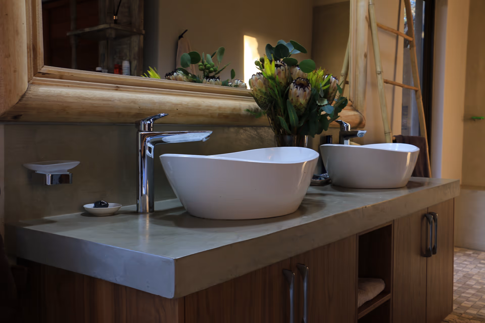 From the outset, this home was about place—respecting it, responding to it, and building in harmony with it. The site, nestled into a high bank within the Leadwood Big Game Estate, offered panoramic views over a dry riverbed frequented by wildlife. But it also posed unique engineering challenges: careful foundation work was needed to ensure stability without disturbing the surrounding trees and soil.